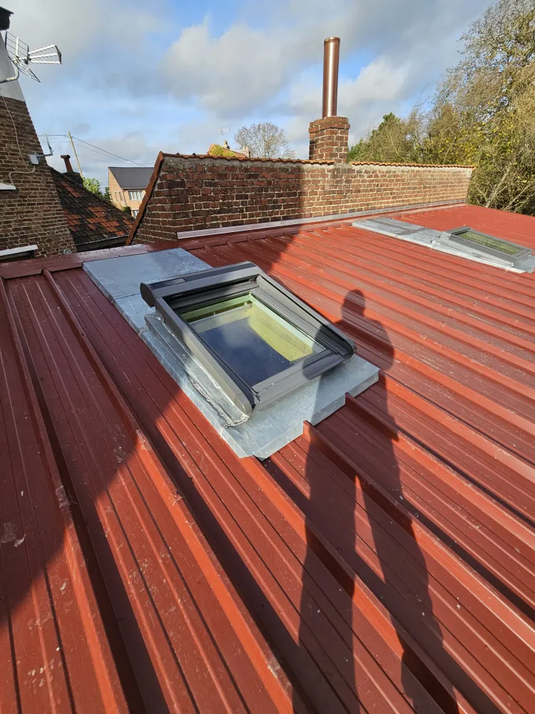Pour apporter lumière et ventilation, nous avons installé des VELUX 78x98 équipés de volets solaires, intégrés grâce à la fabrication de costières sur mesure en zinc. Le tout complété par une étanchéité parfaite et la pose d'une gouttière et de sa descente en zinc, pour une gestion efficace des eaux de pluie.