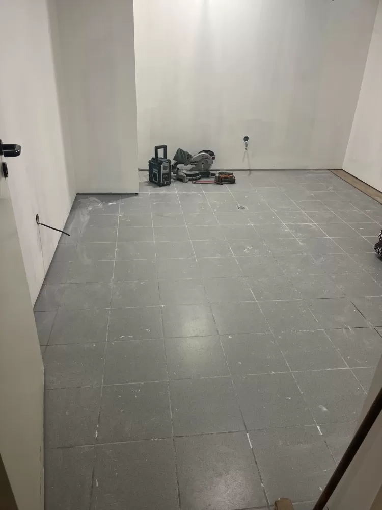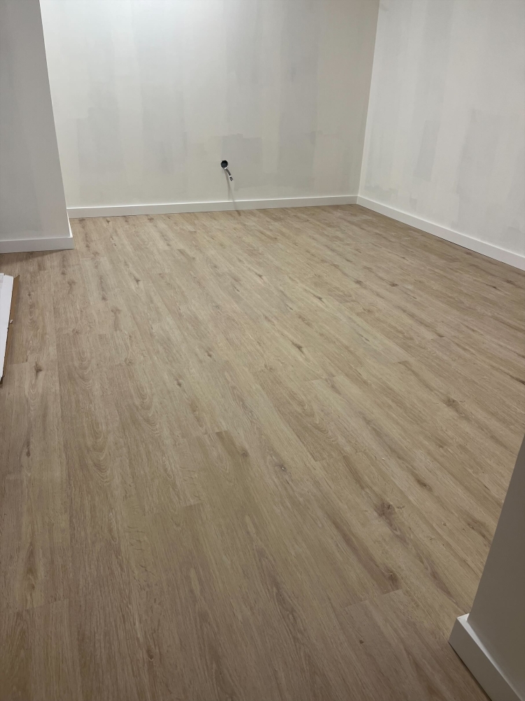 Nous avons transformé un intérieur grâce à la pose d'un parquet stratifié moderne et chaleureux, accompagné de plinthes de finition soignées pour un redu impeccable.